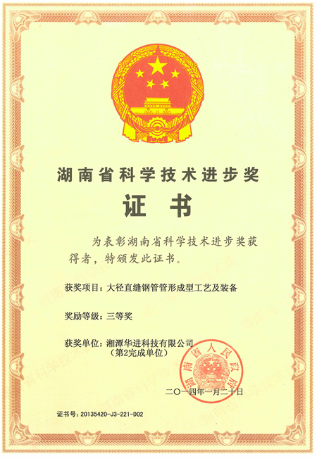 目前,湖南省科學技術廳公布了2013年湖南省科學技術進步獎綜合評審結果,華進科技“大徑直縫鋼管管型成型工藝及裝備”項目榮獲2013年度湖南省科技進步三等獎。