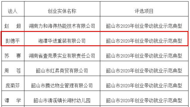 2020年12月1日根據(jù)《關(guān)于印發(fā)<韶山市就業(yè)安置基地(精準(zhǔn)就業(yè)扶貧愛(ài)心單位)創(chuàng)建評(píng)選活動(dòng)實(shí)施方案(試行)>的通知》(韶人社發(fā)〔2019〕5號(hào))《韶山市2020年“創(chuàng)業(yè)之星”評(píng)選獎(jiǎng)勵(lì)工作實(shí)施方案》(韶創(chuàng)辦發(fā)〔2020〕1號(hào))《韶山市開(kāi)展創(chuàng)業(yè)帶動(dòng)就業(yè)示范典型評(píng)選獎(jiǎng)勵(lì)工作實(shí)施方案(試行)》(韶人社發(fā)〔2020〕8號(hào))文件精神,通過(guò)單位申報(bào),鄉(xiāng)鎮(zhèn)、高新區(qū)推薦,市人社局、市科工信局、市財(cái)政局、市扶貧辦等成員單位實(shí)地考察,韶山市創(chuàng)新創(chuàng)業(yè)工作領(lǐng)導(dǎo)小組研究,評(píng)選湘潭華進(jìn)重裝有限公司等19家企業(yè)為韶山市2020年度創(chuàng)業(yè)帶動(dòng)就業(yè)示范典型、韶山市2020年度“創(chuàng)業(yè)之星”12家、韶山市精準(zhǔn)就業(yè)扶貧愛(ài)心單位5家,共36家單位。