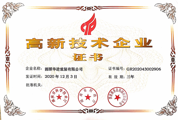 近日,湘潭華進重裝有限公司收到《高新技術企業證書》。本次系華進重裝首次申請高新技術企業認定,華進重裝通過認定連續三年內(2020-2022年度)將享受高新技術企業的相關稅收優惠政策。