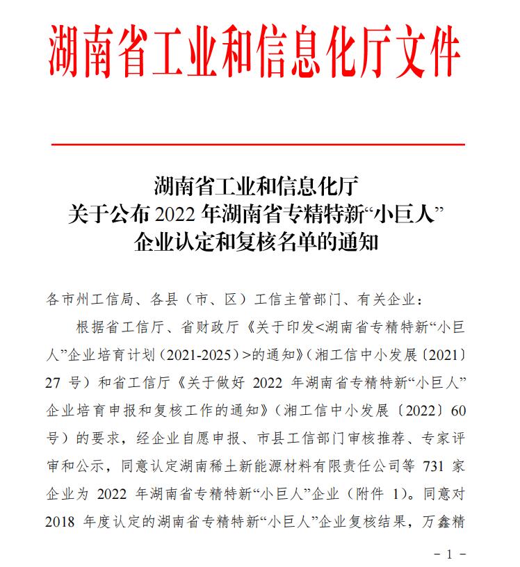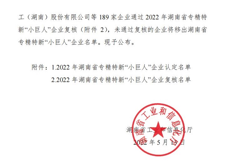 2022年5月5日湖南省工業和信息化廳公布確定湘潭華進重裝有限公司等731家企業為2022年湖南省專精特新“小巨人”企業名單的通知。根據省工信廳、省財政廳《關于印發<湖南省專精特新“小巨人”企業培育計劃(2021-2025)>的通知》(湘工信中小發展〔2021〕27號)和省工信廳《關于做好2022年湖南省專精特新“小巨人”企業培育申報和復核工作的通知》(湘工信中小發展〔2022〕60號)的要求,經企業在線申報、市縣工信部門審核推薦、專家評審的流程來認定湖南省專精特新“小巨人”企業。