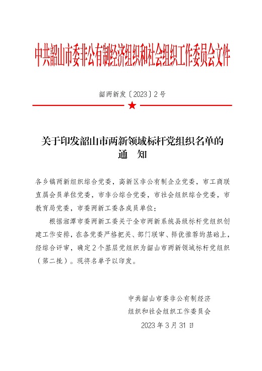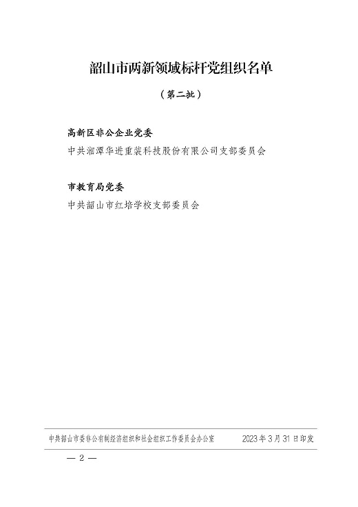 2023年3月31日,根據湘潭市委兩新工委關于全市兩新系統縣級標桿黨組織創建工作安排,在各黨委嚴格把關、部門聯審、擇優推薦的基礎上,經綜合評審,確定中共湘潭華進重裝科技股份有限公司支部委員會等2個基層黨組織為韶山市兩新領域標桿黨組織。