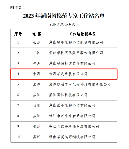 為加強湖南省專家工作站建設績效評價工作,提高工作站運行質量,促進人才培養和科技成果轉化,湖南省科協于2023年6月2日組織專家對63家省級專家工作站進行了 2022 年度考核評審。經過從專家在站工作情況、建站單位保障情況、建站成效、進站專家滿意度、是否產生重大技術突破成果等五個方面進行綜合評價,結合集中評審和現場抽查情況,考核結果優秀且排名靠前的湘潭華進重裝科技股份有限公司等10 家專家工作站,評選為“2023 年湖南省模范專家工作站”。