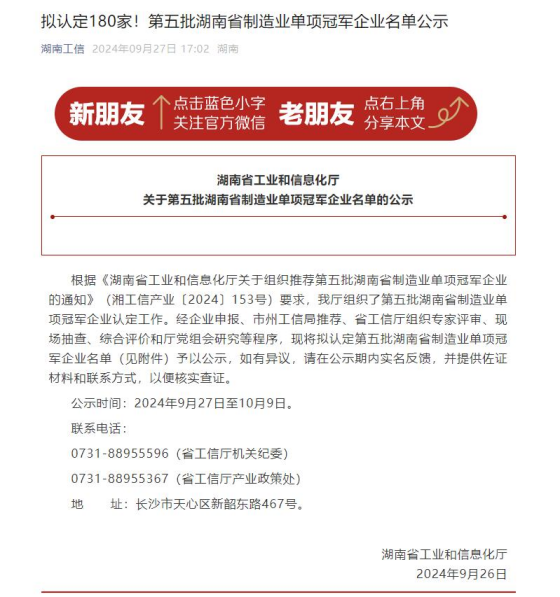 湖南省制造業單項冠軍企業是經企業申報、市州工信局推薦、省工信廳組織專家評審、現場抽查、綜合評價和廳黨組會研究等多個程序,最終評審認定的一批具有自主知識產權、技術含量高、經濟效益好的企業。華進重裝獲此殊榮,表明了企業產品在行業領域的技術領先地位,標志著華進重裝自主創新、研發的綜合實力再上新臺階;是華進重裝技術實力的有力證明,更是公司在金屬管材成形高端裝備研發、制造領域持續深耕、不斷創新的又一里程碑。